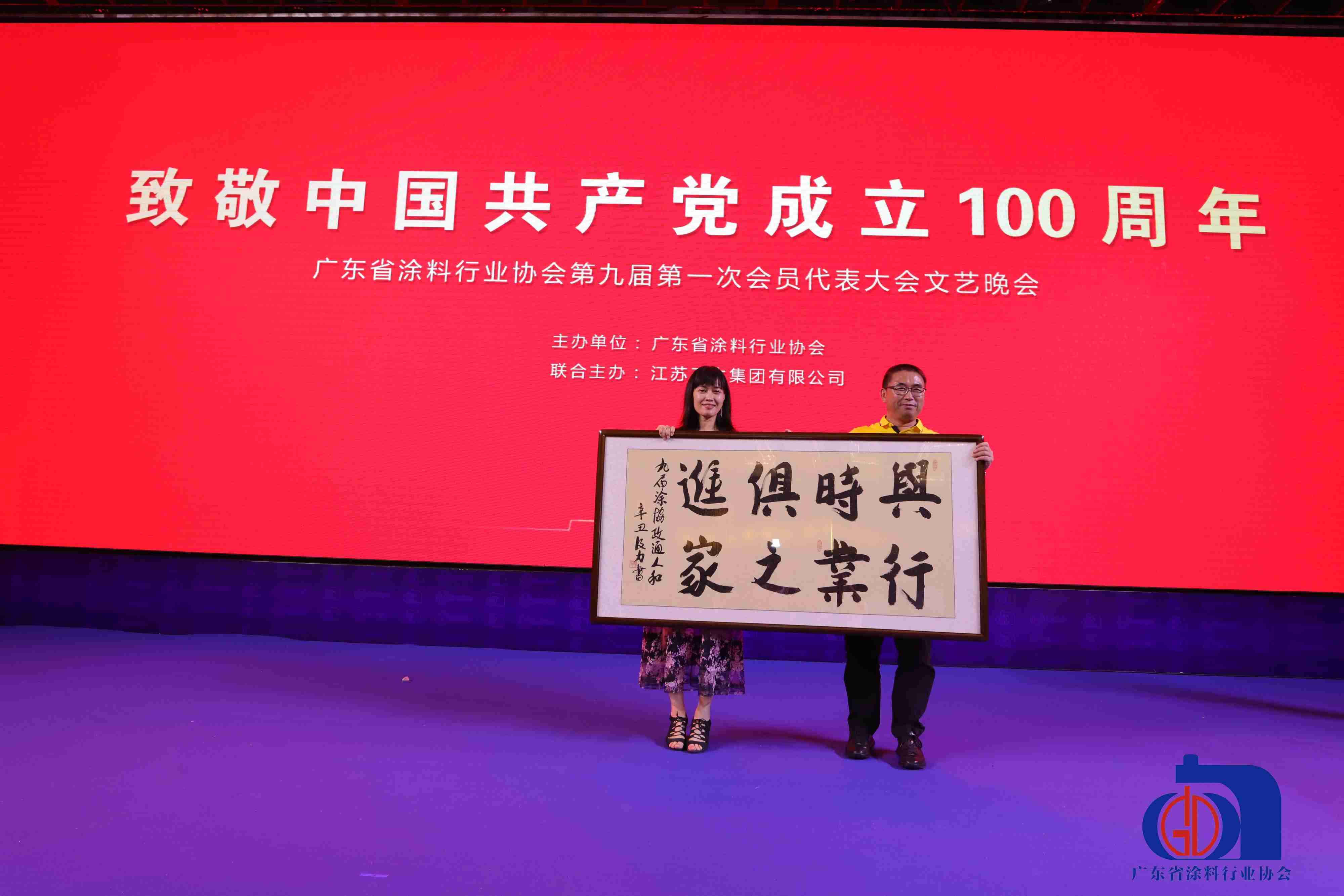 在致敬中國共產黨成立100周年文藝晚會上,政和工程的總經理王芳上台致辭,並抽取了10位幸運兒獲得現金紅包獎,同時向協會贈送了政和工程董事長李昌環為協會書寫的“與時俱進,行業之家”八個大字,充分表達了政和工程對協會工作的高度認可和讚譽。接著政和工程董事長上台激情演唱了一首《我愛你中國》,致敬我們偉大的祖國,並祝願廣東省塗料行業發展越來越好,讓世界看見廣東塗料的精彩!